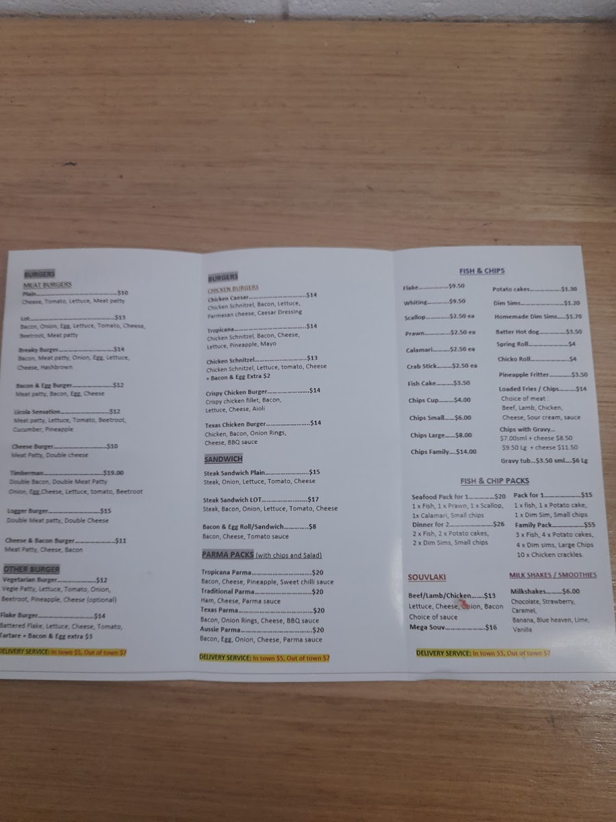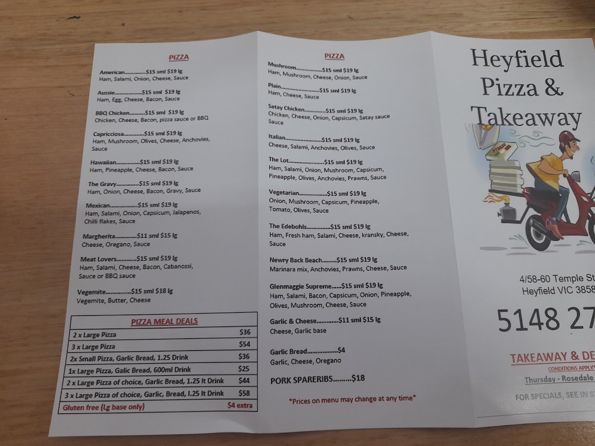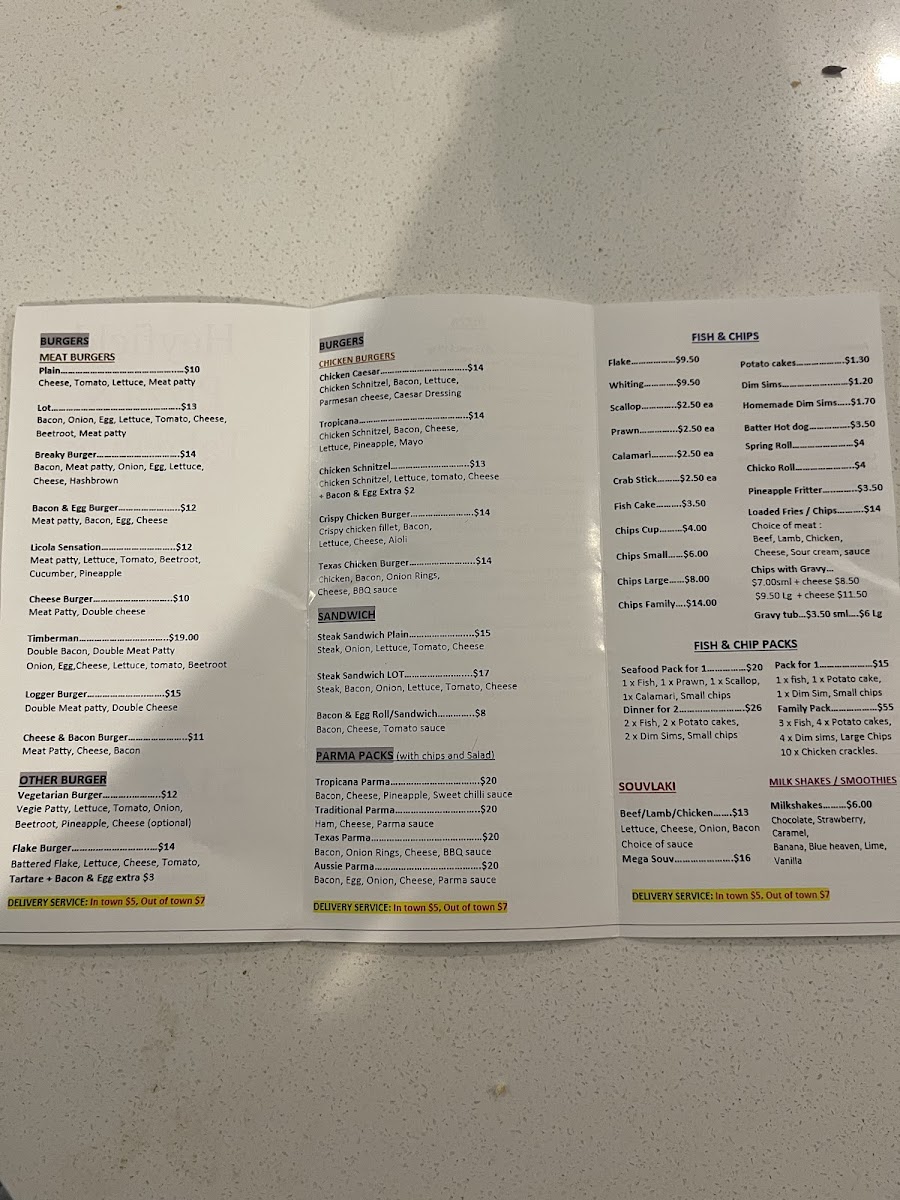 The menu at Heyfield Pizza And Take Away offers a diverse selection of hearty and satisfying meals, perfect for all tastes. The burger options are particularly tempting, featuring items like the Chicken Caesar and Tropicana burgers, alongside the Chicken Schnitzel and Crispy Chicken Burger, with prices reflecting a satisfying balance of quality and affordability. For those in the mood for a sandwich, there’s the classic Steak Sandwich Plain or the loaded Steak Sandwich Lot, along with a tasty Bacon & Egg Roll/Sandwich. If you're craving something a little more indulgent, the Parma packs-like the Tropicana Parma and Traditional Parma-offer hearty portions, while the Texas Parma and Aussie Parma add a bit of extra flair. The fish and chip section includes fan favorites such as Flake, Whiting, Scallop, and Prawn, all of which can be ordered as part of one of the convenient Fish & Chip Packs like the Seafood Pack For 1 or the generous Family Pack. For those looking for a light and fresh option, the Beef Souvlaki is an excellent choice. Other burger varieties like the Vegetarian Burger and Flake Burger cater to different preferences. The Meat Burgers range from the classic Cheese Burger to the hearty Bacon & Egg Burger, with options like the Licola Sensation adding some extra flavor. Pizza lovers are spoiled for choice, with favorites like American, Aussie, BBQ Chicken, and Capricciosa available. The Pizza Meal Deals offer great value, including options like 2 X Large Pizza with Garlic Bread and a 1.25 Drink, or even a combo of 2 X Small Pizza with a drink. Whether you're after a quick bite or a full meal, Heyfield Pizza And Take Away has a satisfying option for everyone.