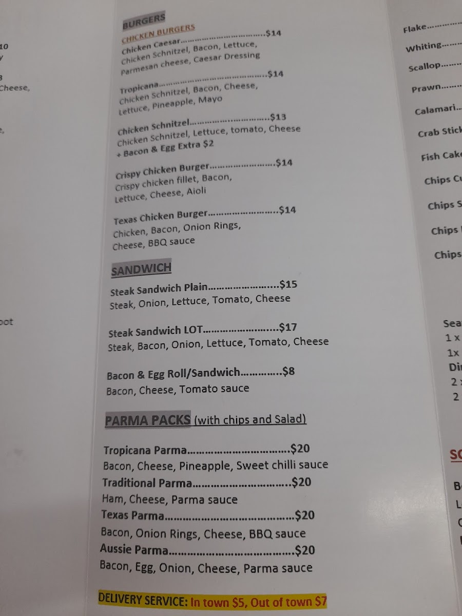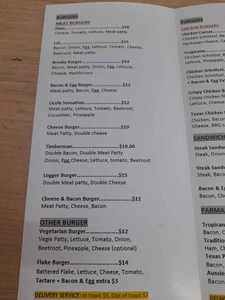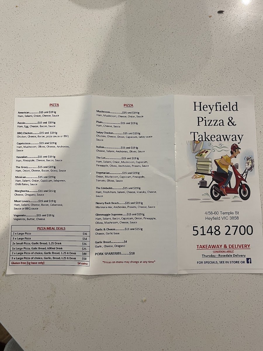 The menu at Heyfield Pizza And Take Away offers a diverse selection of hearty and satisfying meals, perfect for all tastes. The burger options are particularly tempting, featuring items like the Chicken Caesar and Tropicana burgers, alongside the Chicken Schnitzel and Crispy Chicken Burger, with prices reflecting a satisfying balance of quality and affordability. For those in the mood for a sandwich, there’s the classic Steak Sandwich Plain or the loaded Steak Sandwich Lot, along with a tasty Bacon & Egg Roll/Sandwich. If you're craving something a little more indulgent, the Parma packs-like the Tropicana Parma and Traditional Parma-offer hearty portions, while the Texas Parma and Aussie Parma add a bit of extra flair. The fish and chip section includes fan favorites such as Flake, Whiting, Scallop, and Prawn, all of which can be ordered as part of one of the convenient Fish & Chip Packs like the Seafood Pack For 1 or the generous Family Pack. For those looking for a light and fresh option, the Beef Souvlaki is an excellent choice. Other burger varieties like the Vegetarian Burger and Flake Burger cater to different preferences. The Meat Burgers range from the classic Cheese Burger to the hearty Bacon & Egg Burger, with options like the Licola Sensation adding some extra flavor. Pizza lovers are spoiled for choice, with favorites like American, Aussie, BBQ Chicken, and Capricciosa available. The Pizza Meal Deals offer great value, including options like 2 X Large Pizza with Garlic Bread and a 1.25 Drink, or even a combo of 2 X Small Pizza with a drink. Whether you're after a quick bite or a full meal, Heyfield Pizza And Take Away has a satisfying option for everyone.